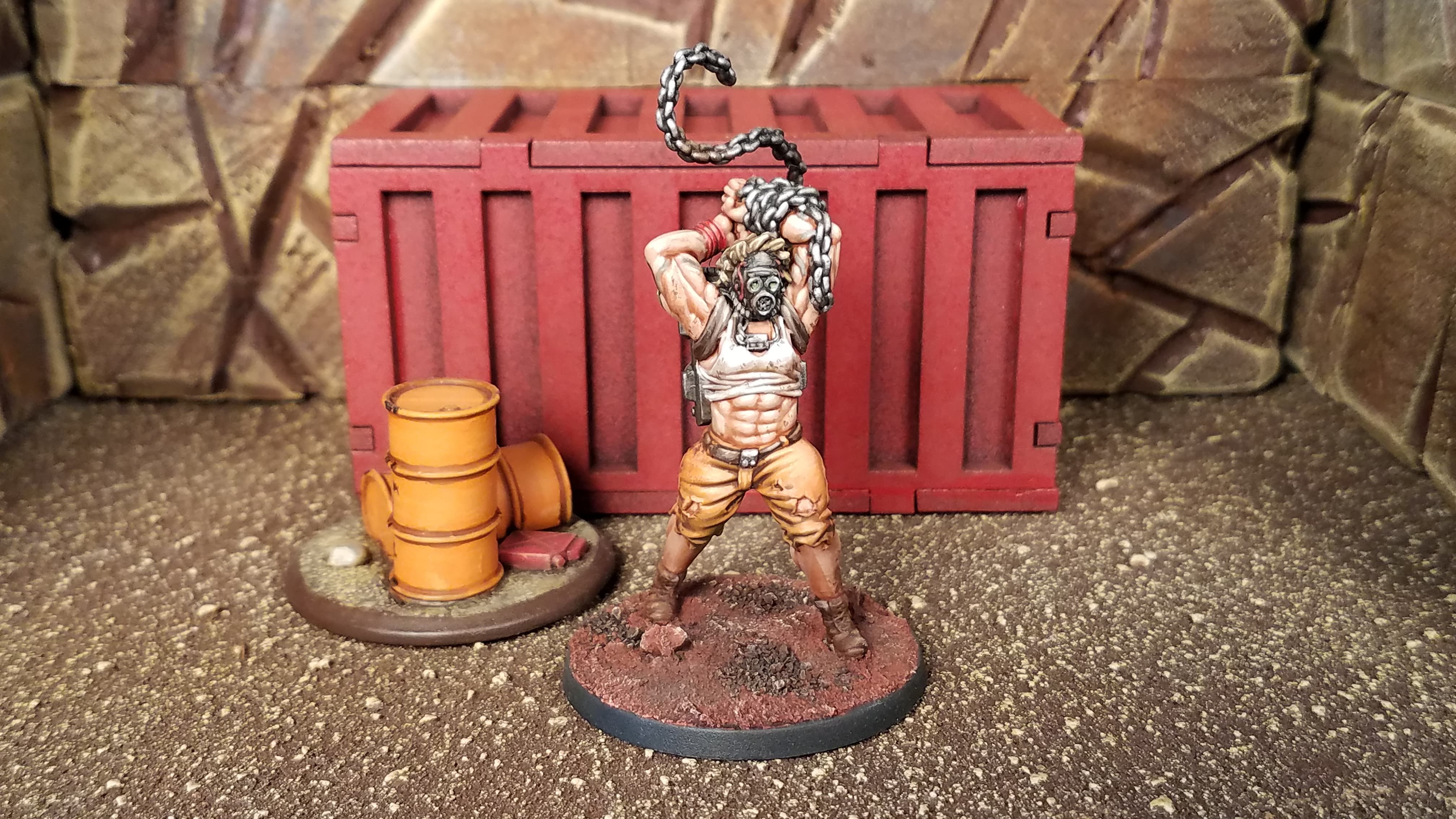 This multipart kit includes 2 head and arm variants with the option to wield either an I-beam or a heavy chain. The kit includes a scenic base perfect to use for an objective or just as scenery in your games. Additional bits like another I-beam, chain, and jerrycan expand your options even further.