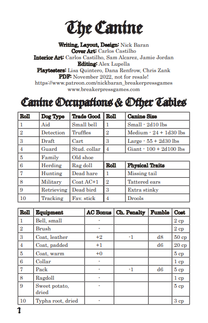 - Tables for determining your Canine's Occupation, Size, and Equipment (based on a copper standard)