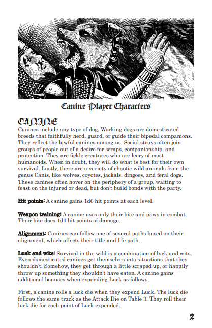 The Canine 2.0 is a player character class for DCC RPG. It first appeared in Rabid Dogs Zine, and has become a fan favorite at my convention games.